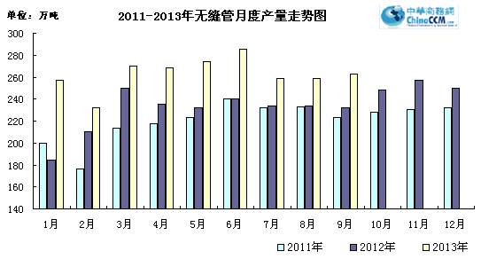 9月份國內無縫管產量262.5萬噸,比去年同期多生產28.1萬噸,同比增長12%。環比8月份增產3.4萬噸,環比增長1.31%。2013年1-9月份國內無縫管累計產量2321.2萬噸,同比增長11%。