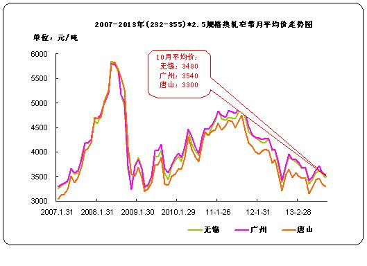 據(jù)中華商務(wù)網(wǎng)監(jiān)測(cè)數(shù)據(jù)顯示,2013年10月我國(guó)11個(gè)主要市場(chǎng)熱軋中寬帶月平均價(jià)格3505元/噸,與上月相比跌46元。其中天津、無(wú)錫、廣州四個(gè)主要市場(chǎng)10月平均價(jià)格分別為3440元/噸、3500元/噸、3580元/噸,分別較上個(gè)月跌40元/噸,跌50元/噸,跌50元/噸。