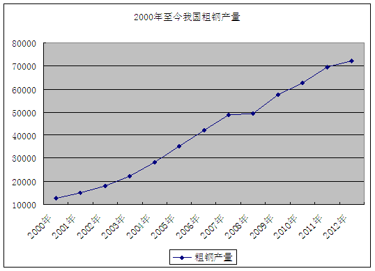 2000年-2012年我國粗鋼產(chǎn)量統(tǒng)計: