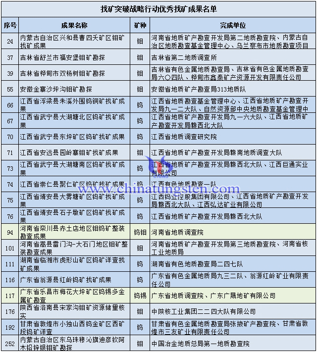 20項鎢鉬找礦突破戰略行動優秀找礦成果